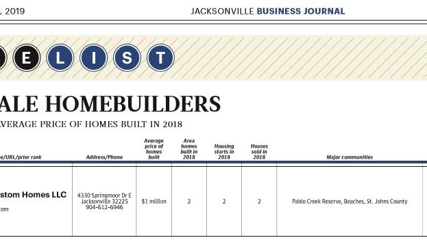 Starr® Custom Homes is pleased to announced that we have once again been named to the Jacksonville Business Journal’s annual “Upscale Homebuilders” list. This year, we rounded out the top ten among the area’s best custom home building firms.